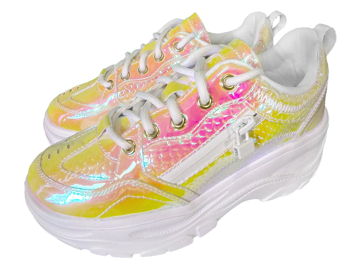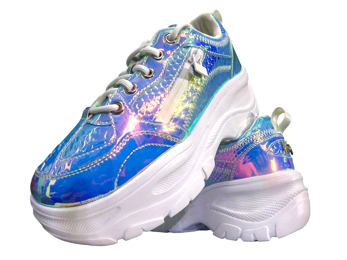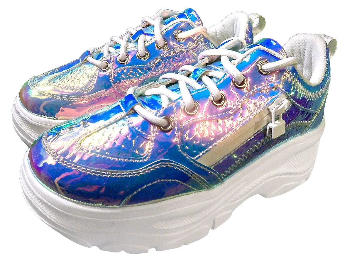 - These cute, iridescent snake print trainers are the perfect ’90s throwback shoe. They feature a durable, lightweight platform sole, and ultra-comfortable cushioned soles. The added side pocket is both practical and fun.