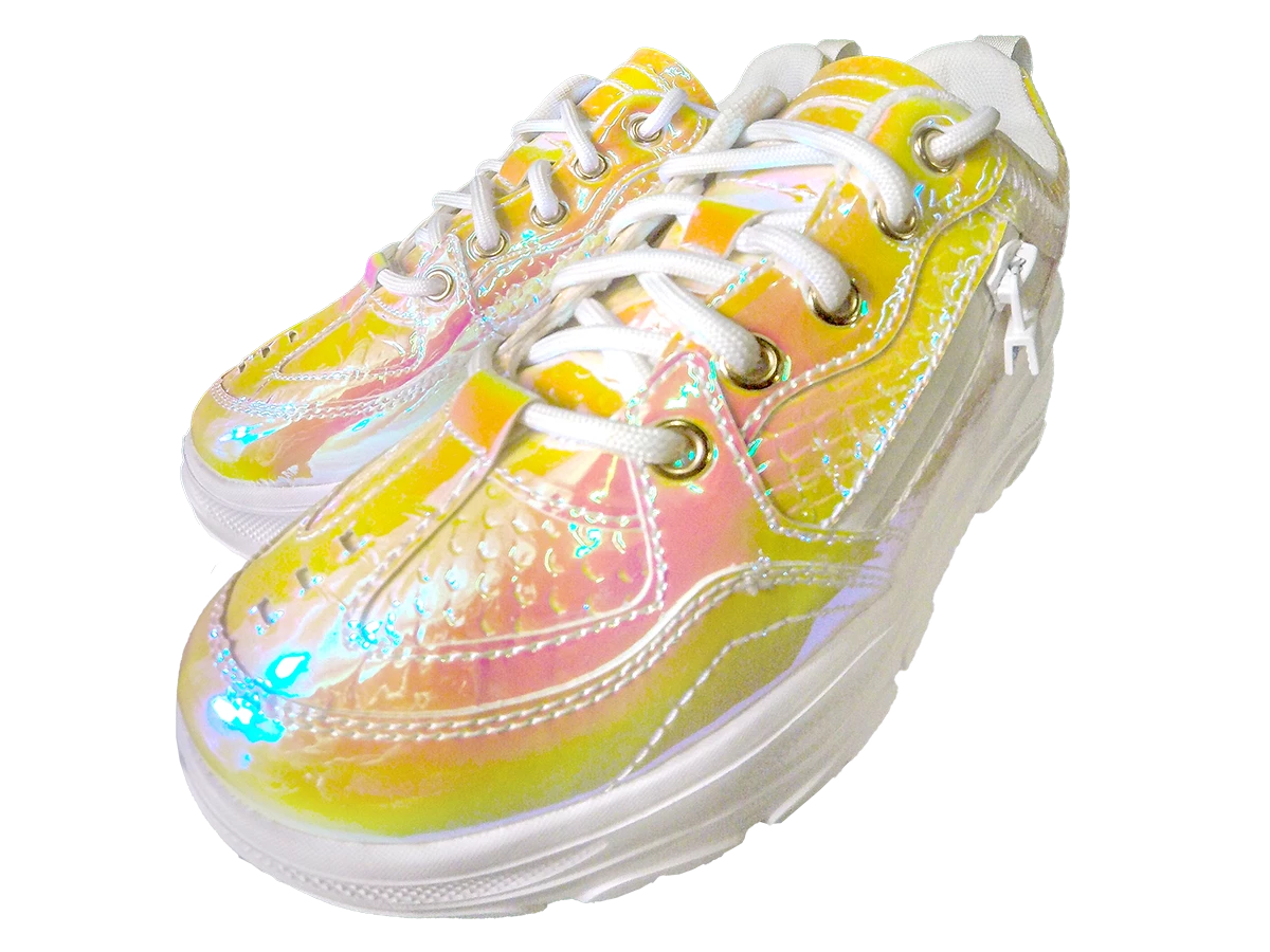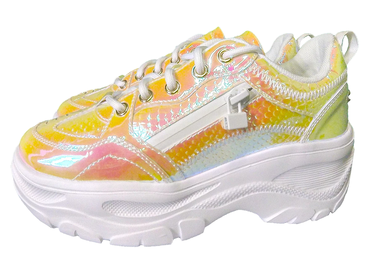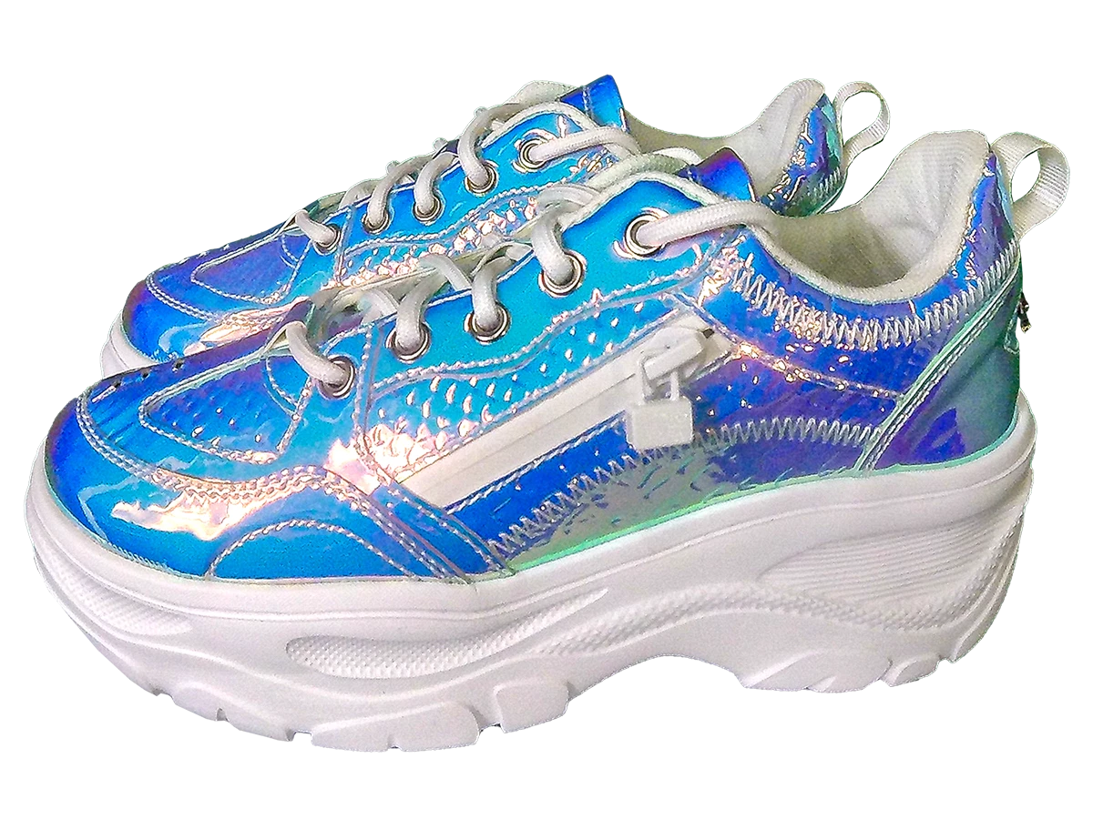 - These cute, iridescent snake print trainers are the perfect ’90s throwback shoe. They feature a durable, lightweight platform sole, and ultra-comfortable cushioned soles. The added side pocket is both practical and fun.